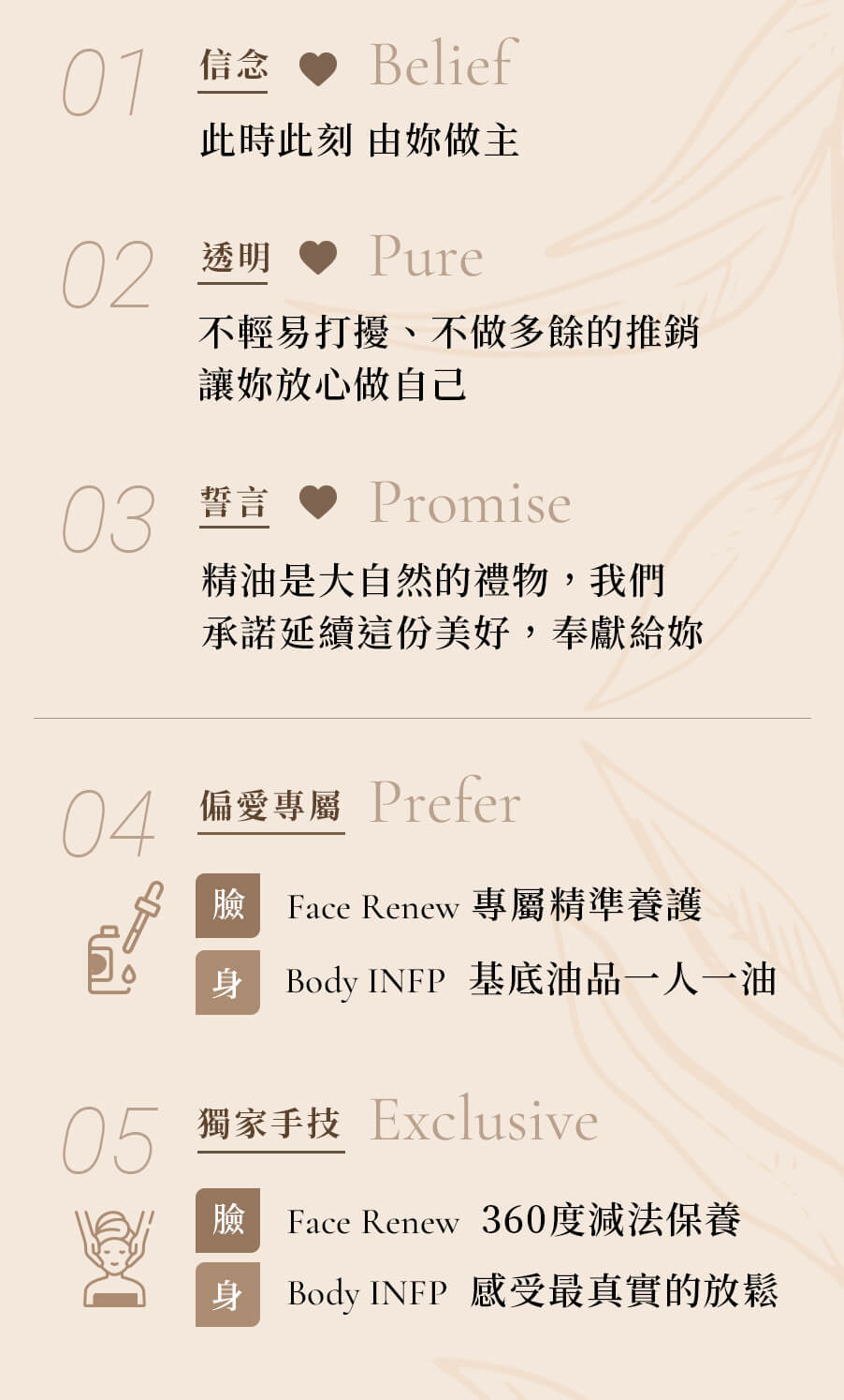 課程中的產品不與人共用也不造成浪費,我們以大地美意為基礎,將精油作為一份特別的禮物帶回家,延續SPA的美好感受