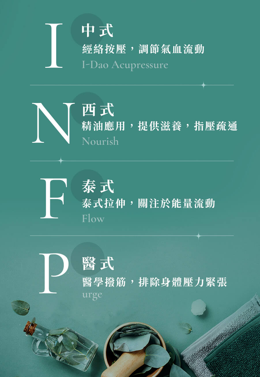 融合中、西、泰、醫等多種技法,為您帶來真實放鬆的體驗。