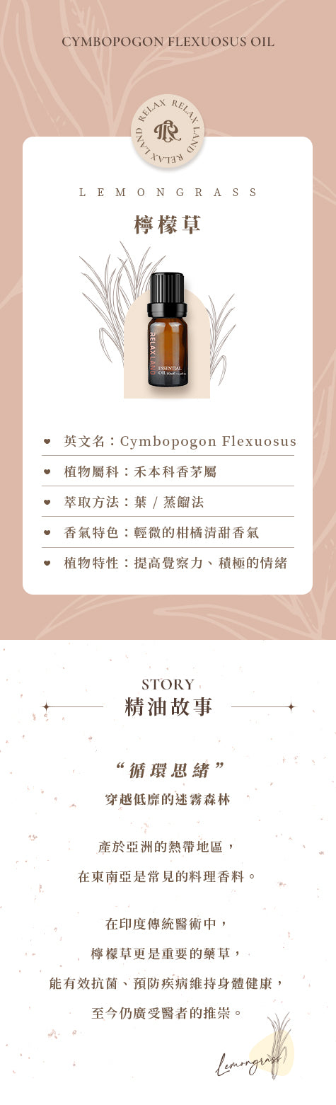 輕微的柑橘甜味,清新草本香氣能提高覺察力,促進積極的身心情緒