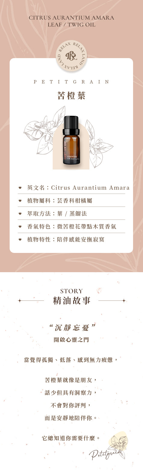 淡淡橙花香帶有些微苦味,草本與木質交替散發香,溫柔具陪伴感,能安撫寂寞感