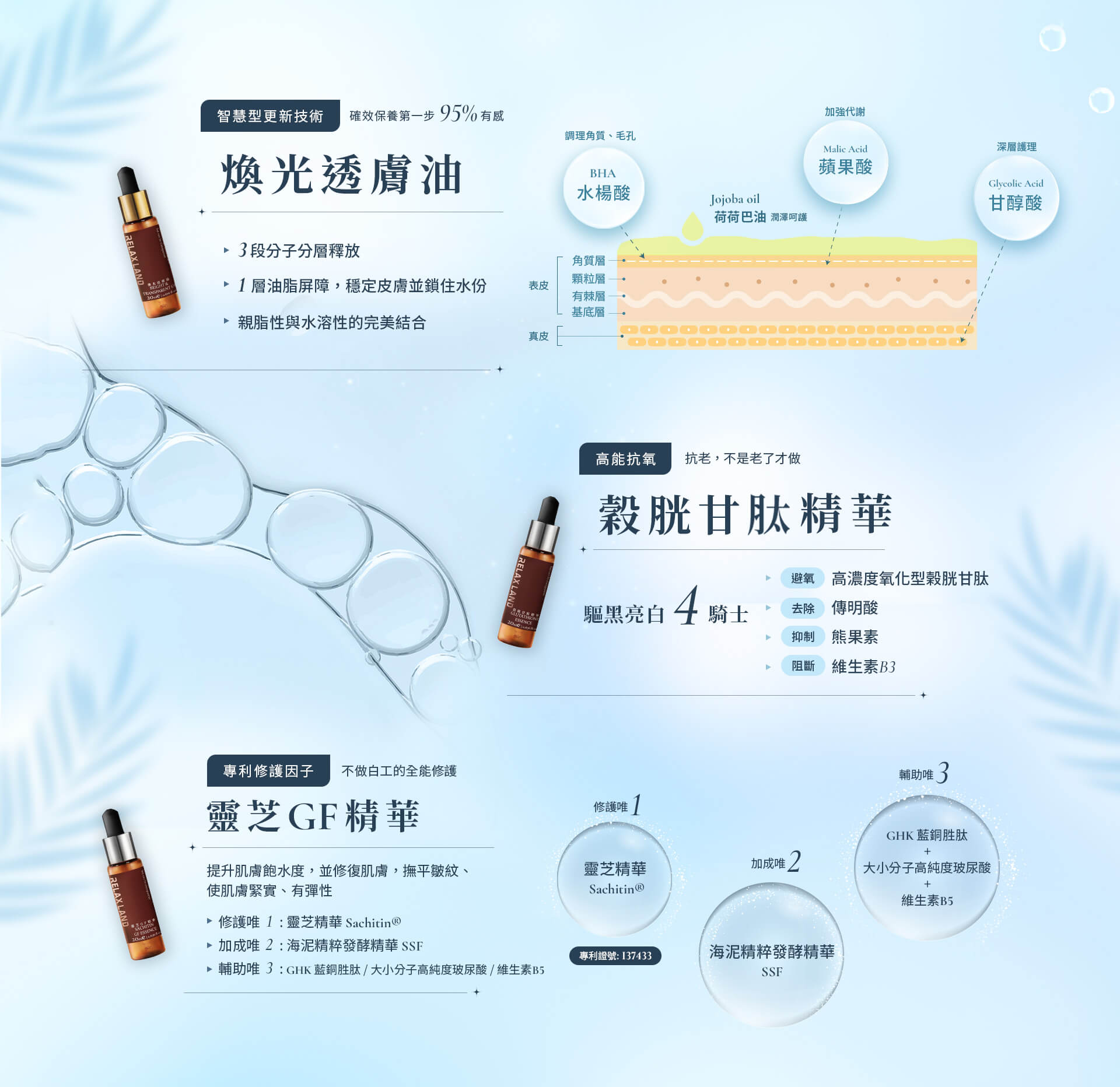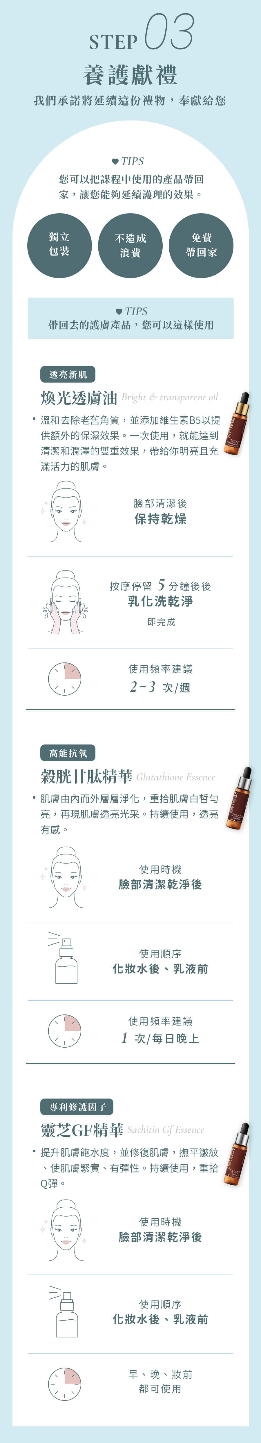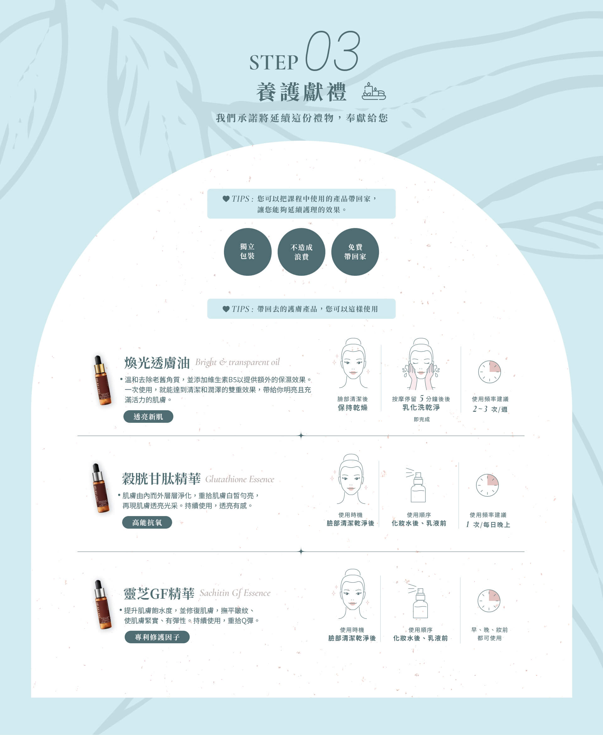 課程中使用到的養護產品有「煥光透膚油」、高能抗氧的「穀胱甘肽」與專利修護因子「靈芝GF精華」