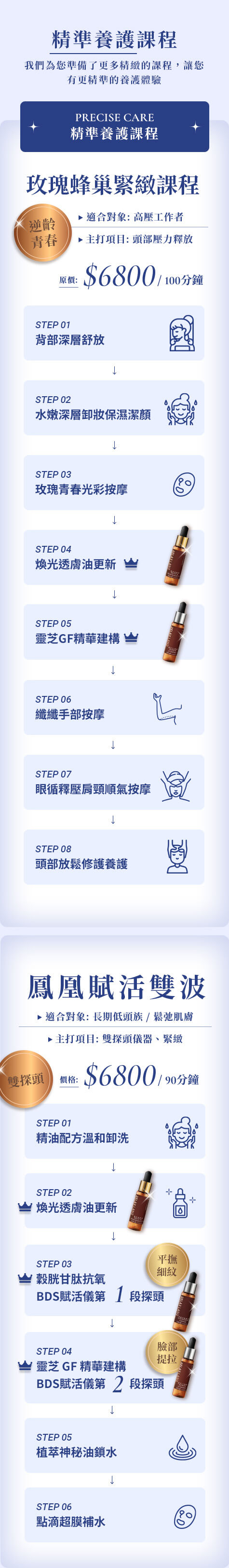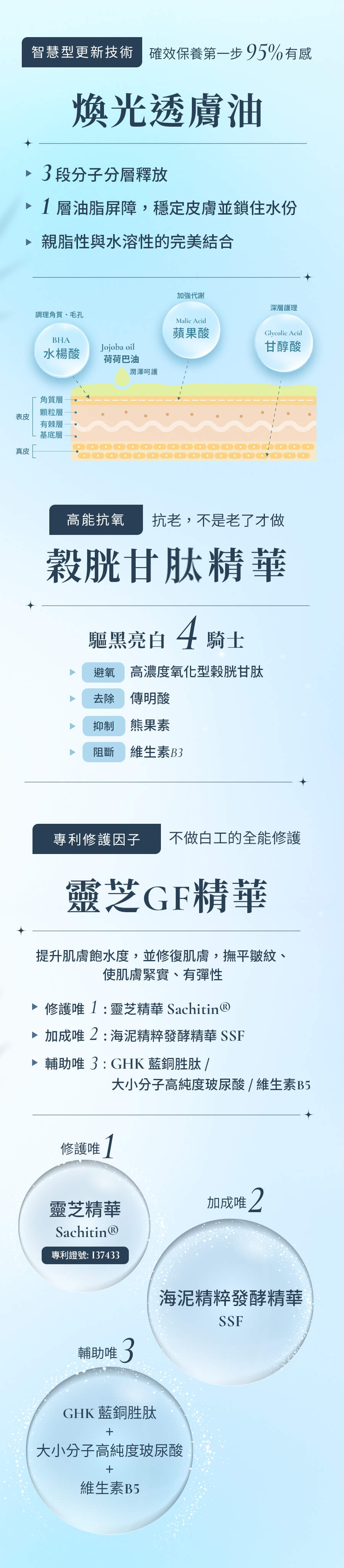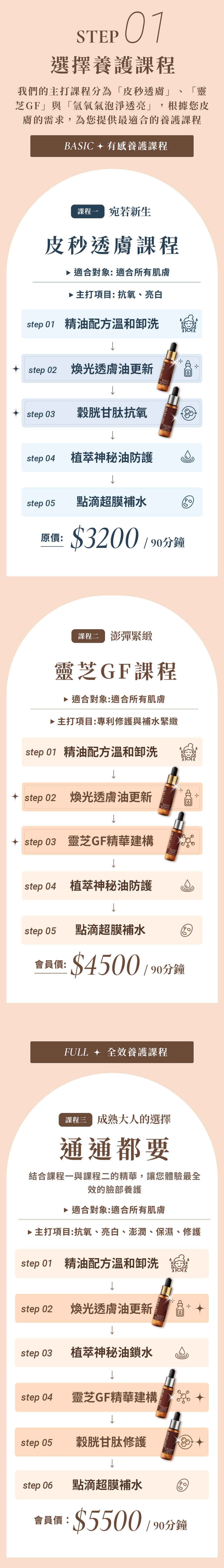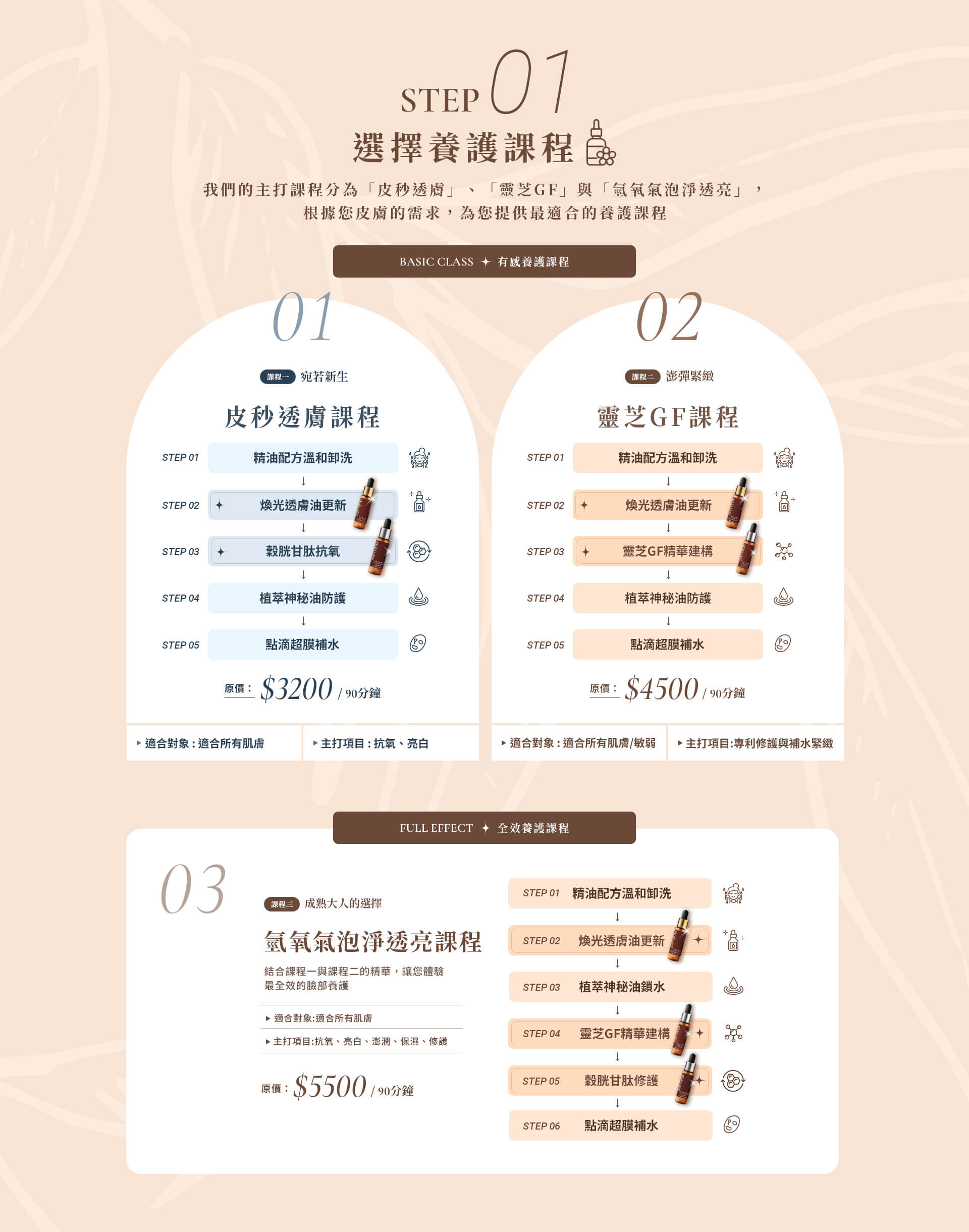 課程中使用到的養護產品有「煥光透膚油」、高能抗氧的「穀胱甘肽」與專利修護因子「靈芝GF精華」